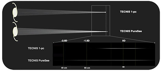 2017年に欧州で先行発売され、臨床評価が高く海外での使用実績も多く、日本国内でトップシェアとなっている3焦点の多焦点眼内レンズです。日本では2019年に厚労省の認可を受け、2022年に素材が改良された現在のモデルが認可されています。従来の2焦点レンズではピントが遠方と近方にわかれるため、中間距離の見え方が弱くなってしまうことが問題でしたが、3焦点レンズでは遠方、中間距離、近方に焦点を配分することで、その弱点をカバーして、より自然な見え方になります。